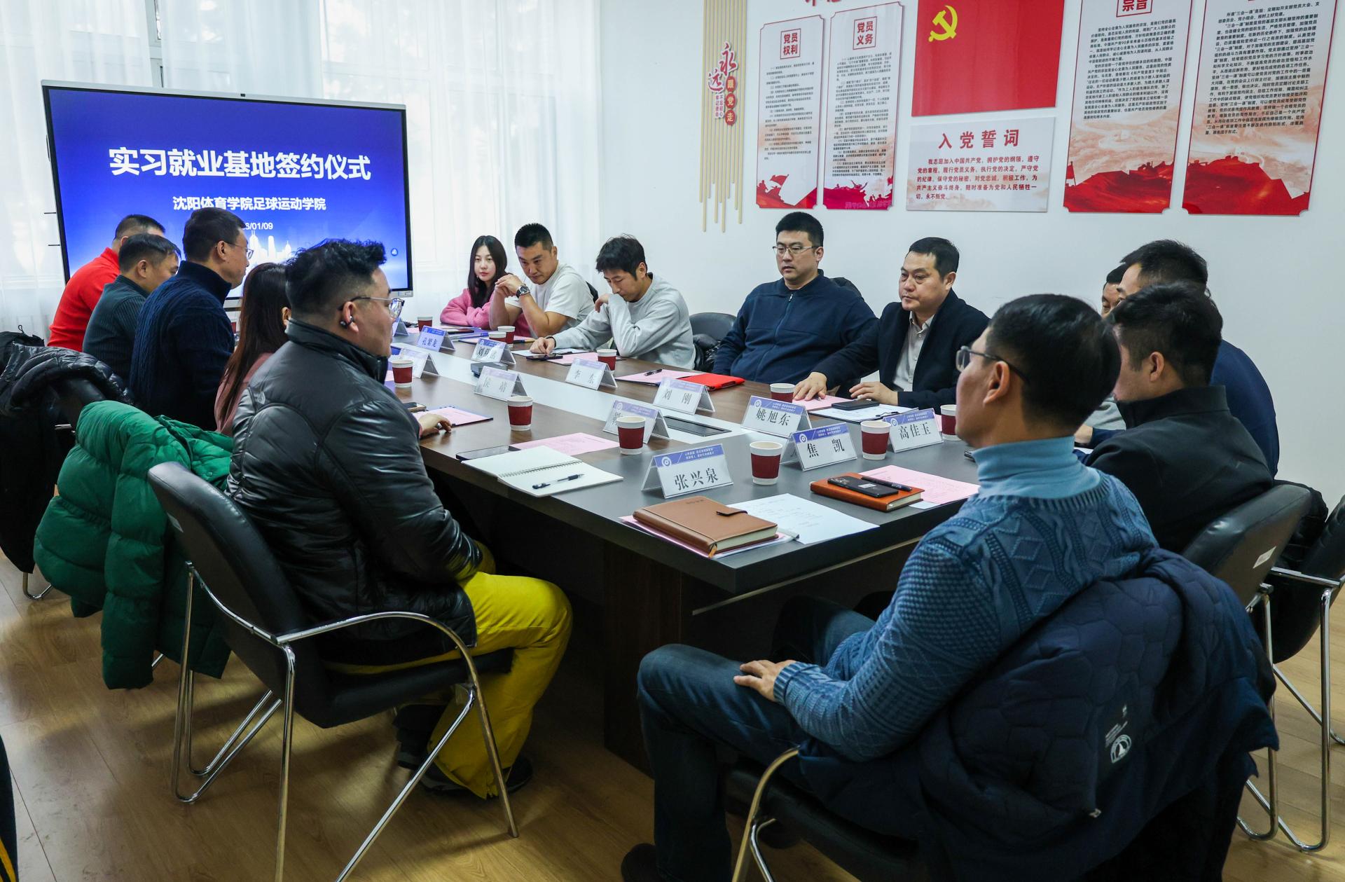 2026年1月9日下午,沈阳体育学院足球运动学院在学院会议室举行实习就业基地签约仪式。学院党总支书记焦凯、院长张兴泉、副院长高佳玉出席活动,并与沈阳市体育事业发展中心、奥美体育、营口市第二十九中学、沈阳铁路实验小学、沈阳市浑南区新中科实验学校、哈尔滨襄龙足球俱乐部六家单位代表共同签署合作协议,仪式由副院长高佳玉主持。