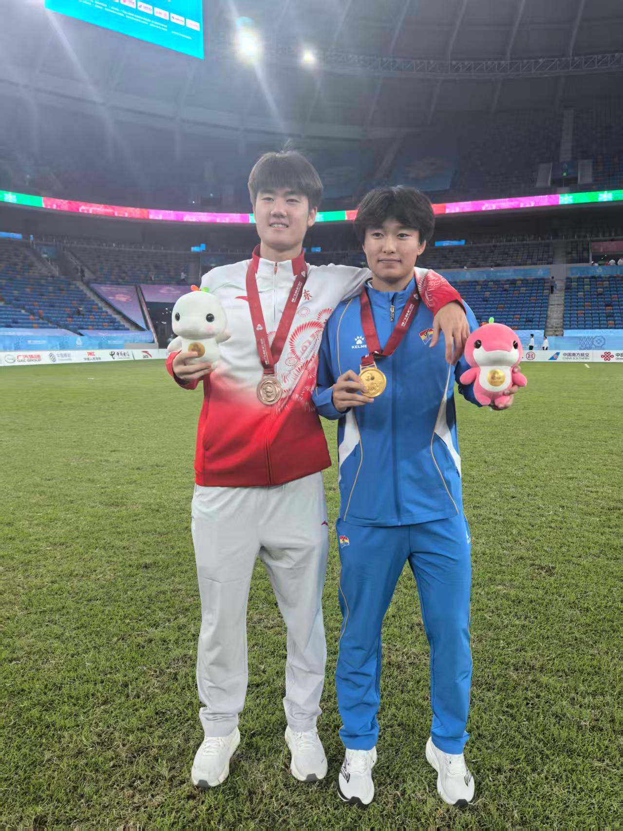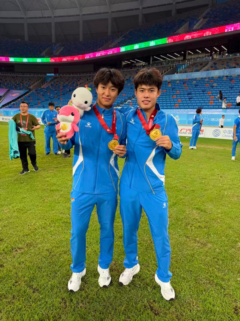 10月25日决赛中,辽宁U18男足历经加时赛与点球大战,以5:4战胜山东队,时隔十二年再夺全运会冠军。我院2025级学生宁正轩、文骏作为辽宁队重要成员,在比赛中展现了出色的竞技水平、顽强的拼搏精神和良好的战术素养。